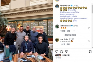 维耶里参加国际足联的活动,他在社交媒体上晒出与大罗、卡纳瓦罗、马特拉齐、巴乔、托蒂、坎德拉的合照。