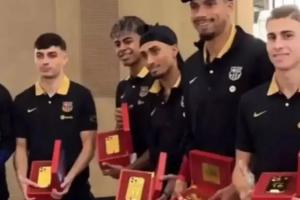 体育资讯12月11日讯 据每体报道,巴萨球员今日收到了到访巴萨的阿联酋客人送出的金色定制款iPhone 17 Pro Max。