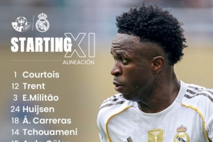 皇马首发:1-库尔图瓦、12-阿诺德、3-米利唐、24-怀森、18-A费、14-琼阿梅尼、15-居勒尔、19-塞巴略斯、21-迪亚斯、10-姆巴佩、7-维尼修斯