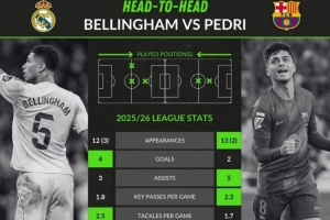 贝林厄姆:12首发、3替补,4球、3助攻,1.8关键传球、2.5抢断、1.3过人,传球成功率89.6%,获评7.44分