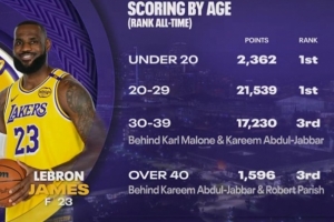 詹姆斯各个年龄段得分排名: