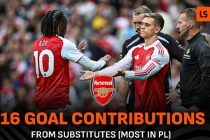 本赛季,阿森纳替补球员在英超参与了16个进球,在联赛排名第一,而曼城的替补球员只参与2个进球,联赛最少。