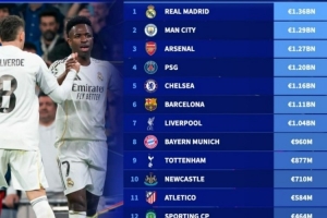 欧冠16强德转身价榜:皇马居首,曼城、阿森纳、巴黎、切尔西前五