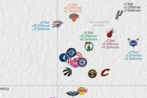 体育资讯3月6日讯 今天,美媒Kirk Goldsberry晒图统计了NBA过去10场比赛所有球队的攻防效率,详情入下: