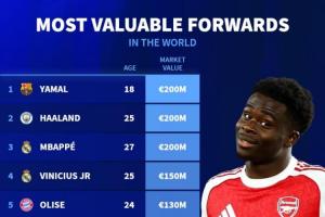体育资讯03月08日讯 明天,德转将会更新英超球员身价,德转今天列出了现在的前锋位置球员身价榜,亚马尔、哈兰德、姆巴佩2亿欧居首。