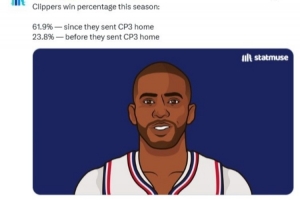 美媒晒出数据,快船送走保罗前胜率23.8%,送走保罗之后的胜率为61.9%。