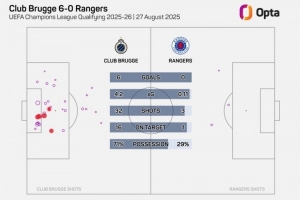 据OptaJohan的数据统计,布鲁日6-0大胜流浪者,这是他们自2001年9月27日(7-1尼科西亚奥林匹亚科斯)以来在欧战中最大比分的胜利。