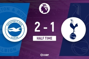 伤停补时3分钟。上半场比赛结束,布莱顿2-1热刺。