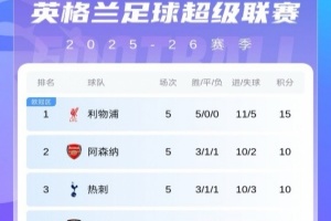 体育资讯9月22日讯 阿森纳vs曼城比赛结束,最新积分榜情况出炉。