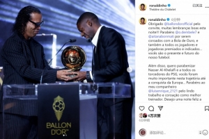 罗纳尔迪尼奥社媒晒出颁奖照片,并写道:“感谢金球奖的邀请,今晚留下了许多美好的回忆!恭喜登贝莱和邦马蒂荣获金球奖,也祝贺所有获奖和入围的球员们……你们是足球的现在和未来。”
