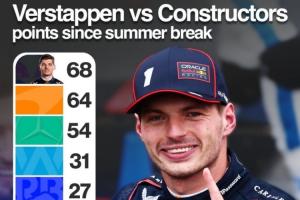 体育资讯09月23日讯 F1阿塞拜疆大奖赛,维斯塔潘杆位夺冠。据Sundaram R统计,维斯塔潘夏休期后一个人拿的分数比其它任何车队拿到的都多。