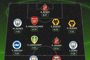 中场:明特(布莱顿)、朗斯塔夫(利兹联)、扎卡(桑德兰)、多库(曼城)