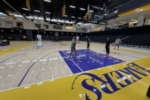 体育资讯10月10日讯 昨日,湖人记者Jovan Buha晒出湖人训练场的照片,并提到在三分线内多了一条“两分线”。