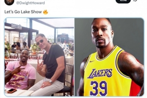 前湖人球员霍华德更新推特,他晒出了自己与佩林卡的合照,和自己身穿湖人39号的P图,写道:“湖人,加油!”