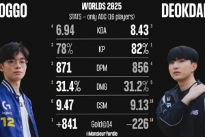 Doggo在分均输出、伤害占比、分均补刀、14分钟对位经济差方面多项领先,而Deokdam在KDA、参团率方面较为领先。