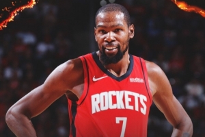 赛后火箭官方晒出赢球海报,封面人物是杜兰特。